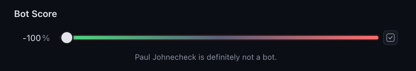 Users can publish their perspectives on whether other users are bots. They score other users on a scale of -1 to 1 (or, equivalently, -100% to 100%). Users don't need to input these as numbers; an app might present this as a slider or as a few options.